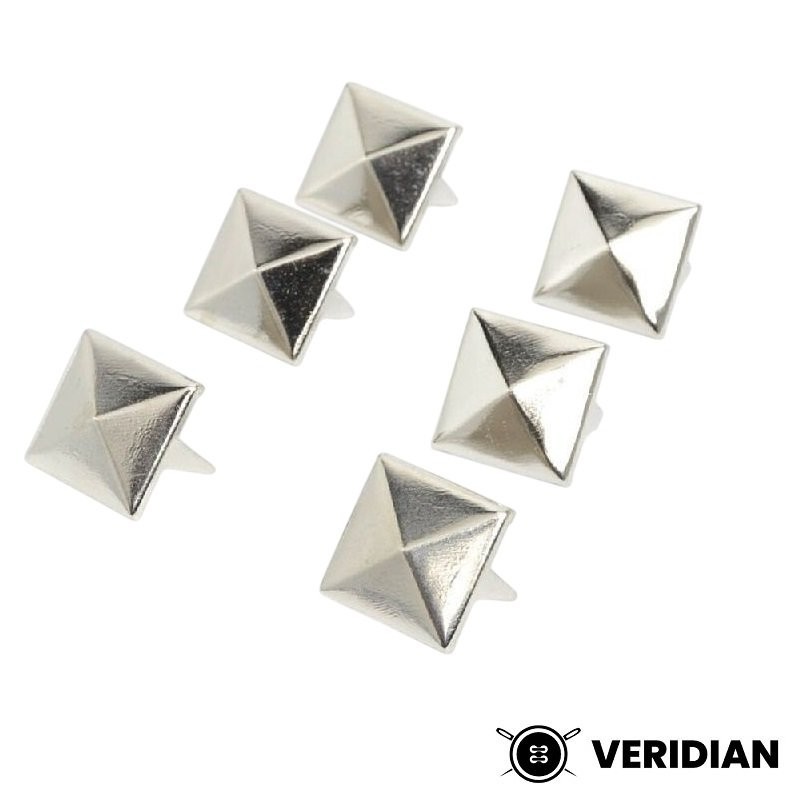 Pyramide à griffe pour la décoration de vos articles en cuir ou comme pieds de sac. Lot de 10 pièces de 10mm de diamètre. Plaqué nickel. Fixation par 4 griffes de 4mm traversant le cuir.