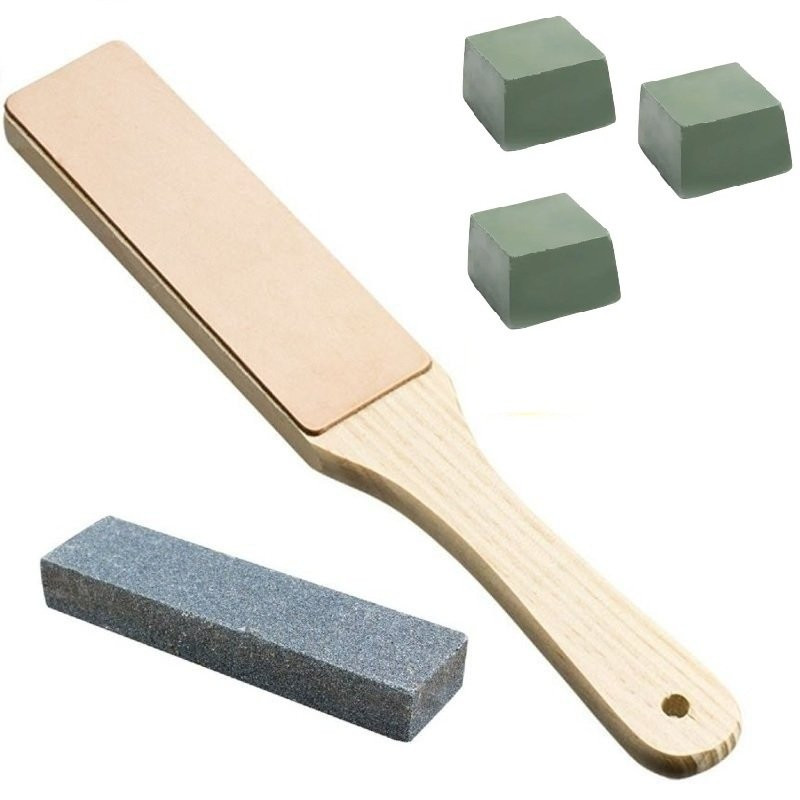 Kit d'affûtage : Affiloir (Strop) en bois recouvert de cuir végétal, partie pleine fleur d'un côté et partie chair sur l'autre face, 3 pates à polir et pierre à aiguiser