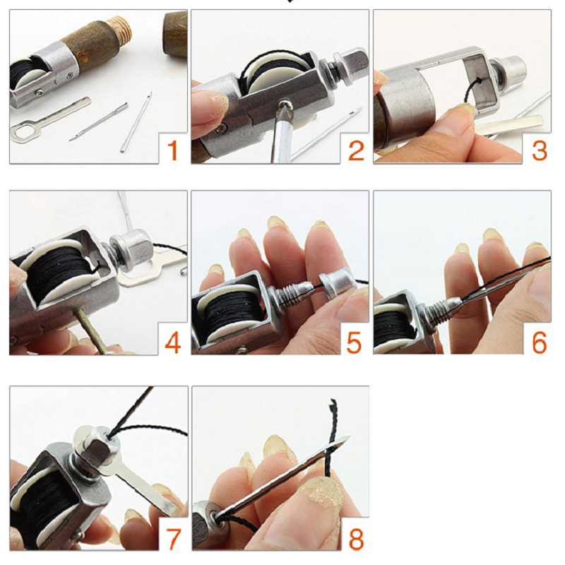 Passage du fil : Après avoir percé les trous, l'artisan maintient la pression sur l'alêne coud-vite tout en la faisant pivoter légèrement. Cela entraîne le passage du fil à travers les trous percés. Certains modèles peuvent avoir un guide intégré pour faciliter cette étape.