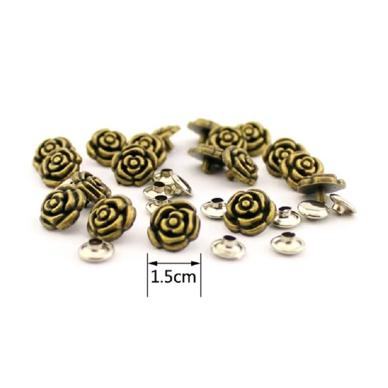Concho fleur rose finition laiton vieilli de 15mm de diamètre avec fixation par rivetage (Rivet fourni). 1 pièce.