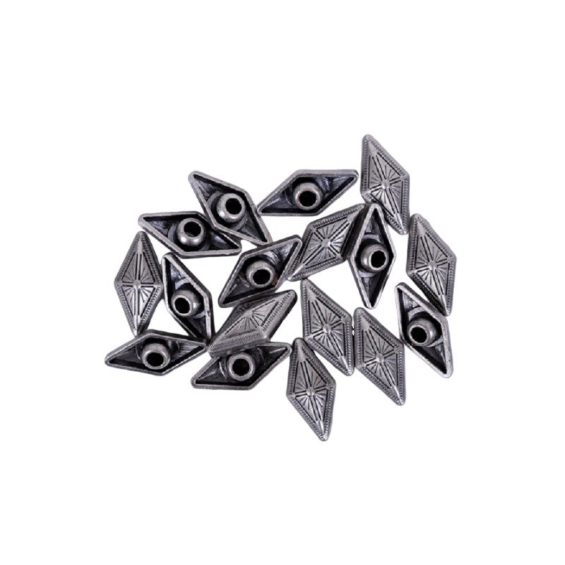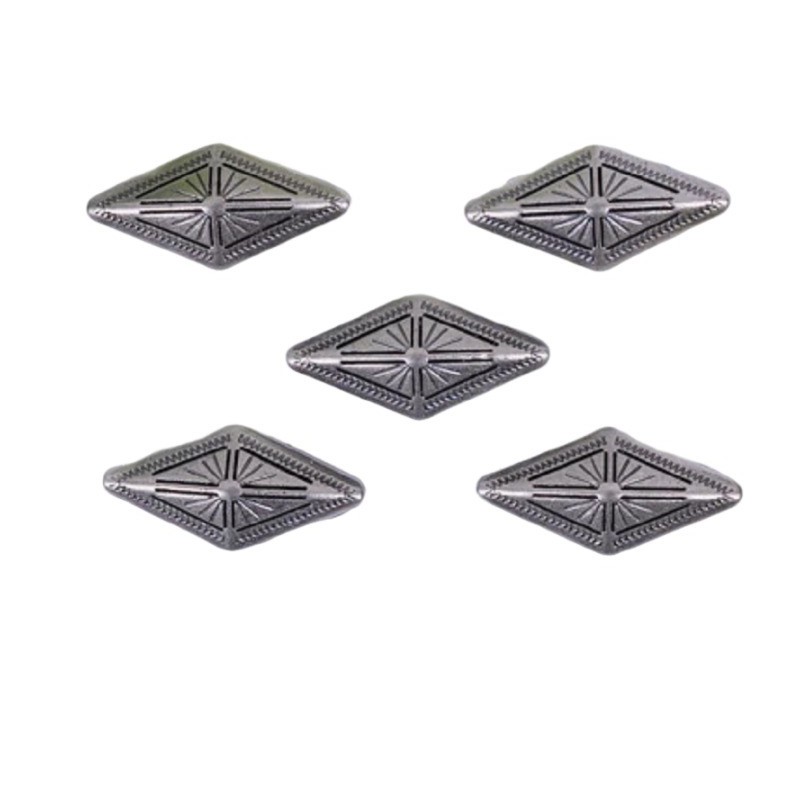 Ces conchos, vendus par lot de 5, sont des ornements métalliques en forme de losange, spécialement conçus pour être fixés sur du cuir à l'aide de rivets. Leur design géométrique et leur finition argentée leur confèrent un aspect à la fois moderne et élégant.