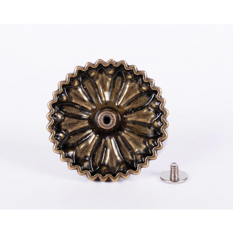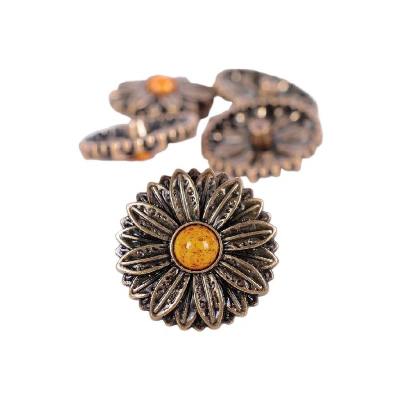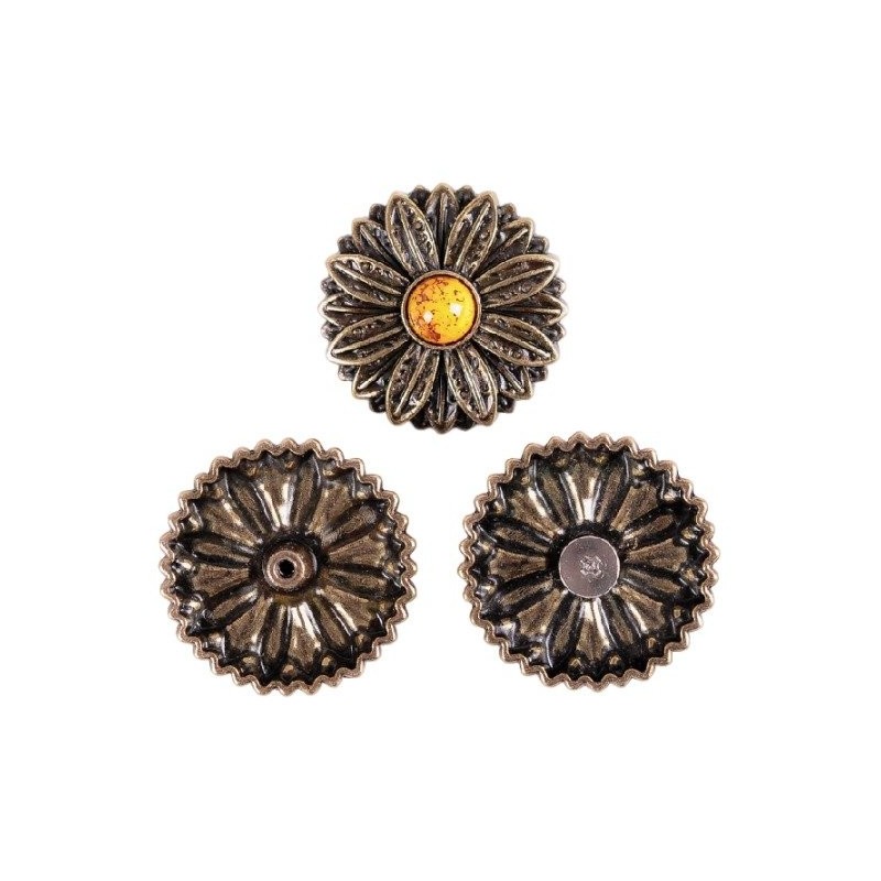 Concho style florale en laiton finition antique avec imitation pierre au centre, diamètre 30mm. Fixation par vis fourni.