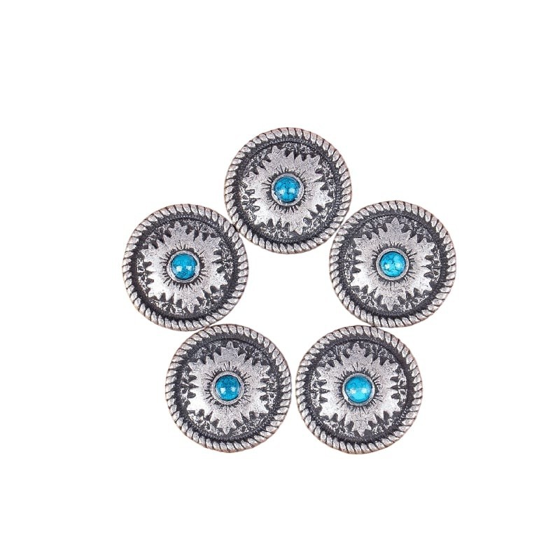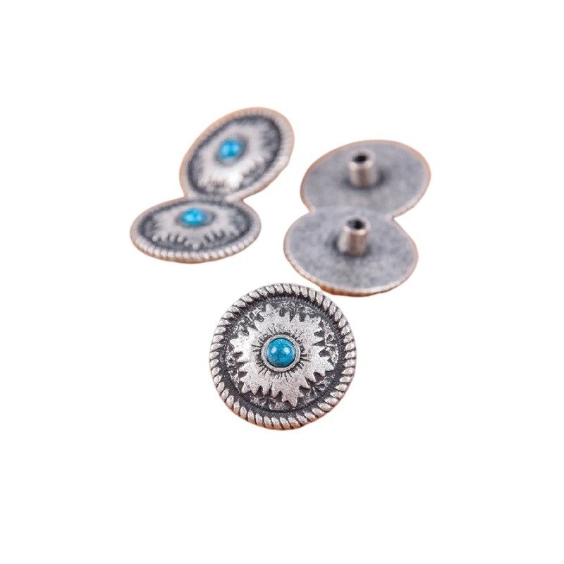 Concho finition antique avec imitation pierre bleu au centre, diamètre 26 mm. Fixation par vis fourni.
