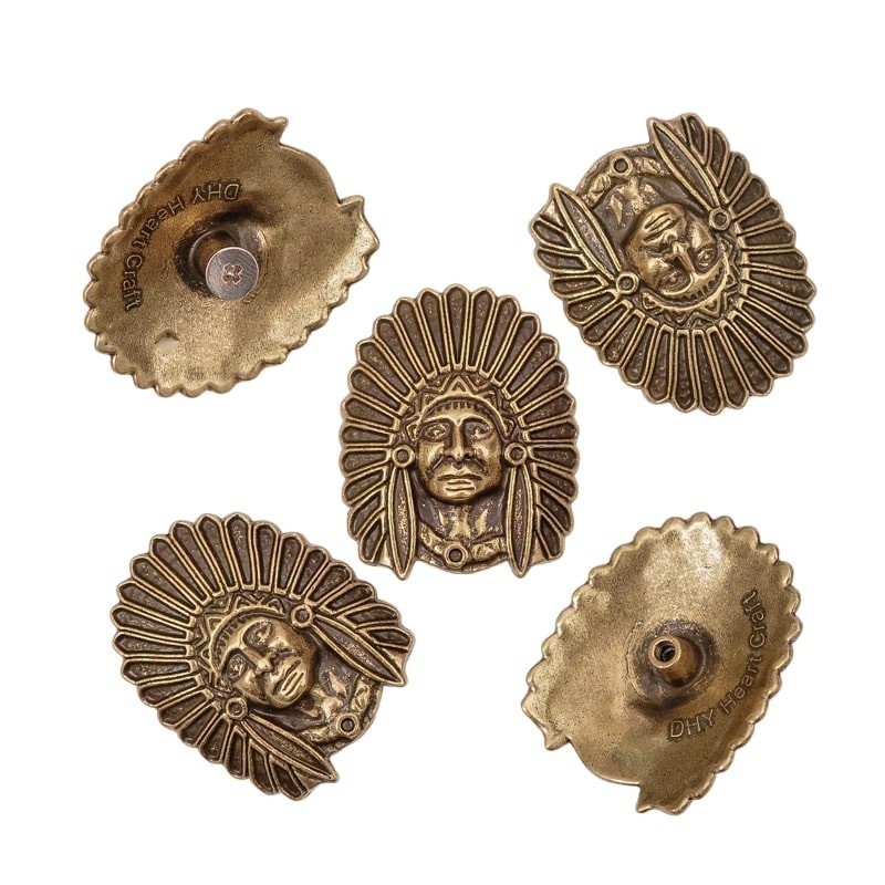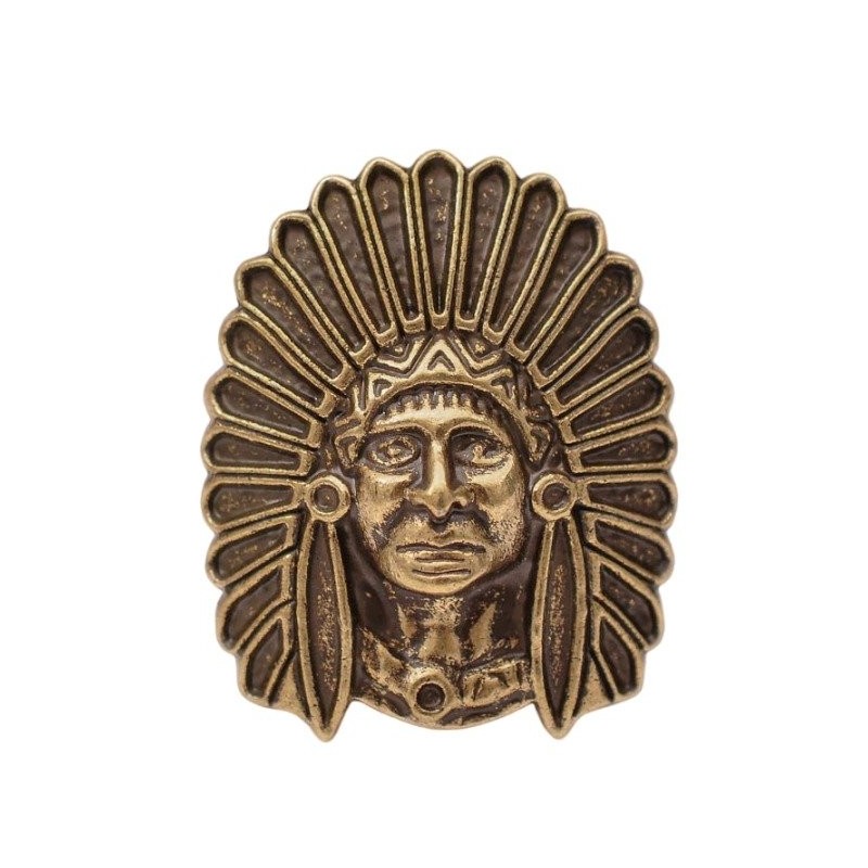 Concho tête d'indien en laiton finition antique, dimensions 39 x 32mm. Fixation par vis fourni.