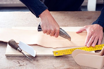 On optimisera la disposition des différentes parties à découper pour éviter au maximum les pertes. La découpe se fera sur un tapis de découpe avec un cutter à lame droite ou circulaire (coupe plus aisée dans les courbes) ou un couteau demi lune également appelé couteau à pieds, ce couteau de découpe est un outil multi-tache très pratique pour couper le cuir, le parer ou suivre un patron. Elle devra être nette et sans bavure, pour cela utilisez une règle métallique pour les coupes droites.