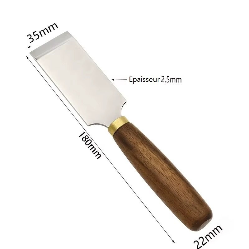 Couteau à parer pour couper ou amincir le cuir en acier poli de haute qualité. Lame aiguisée. Longueur totale : 180mm, lame de 35mm de large. 3 types de lames à choisir : oblique, droite ou arrondie.