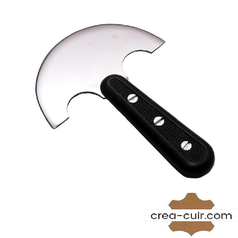 Il sert à découper le cuir en suivant un gabarit et à affiner le cuir. Après quelques temps d'utilisation, ce couteau demi-lune (ou couteau à pied) sera très vite indispensable tant il permet une coupe facile et nette du cuir suivant une règle ou dans les courbes. Utilisez l’affiloir pour l'affûtage et les plaques de découpe.