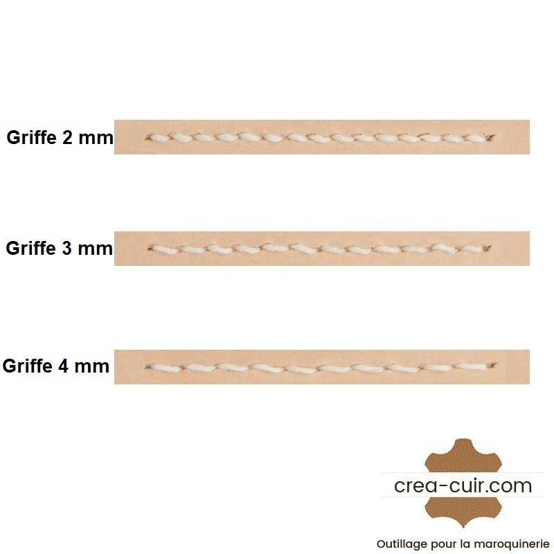 Les griffes de couture du cuir 4mm permettent de réaliser des coutures standard nécessitant une résistance faible. Les griffes de couture du cuir 4mm sont généralement utilisées pour la couture de maroquinerie dîtes de taille intermédiaire (Sac à main par exemple) qui ne nécessite pas de couture à forte résistance.