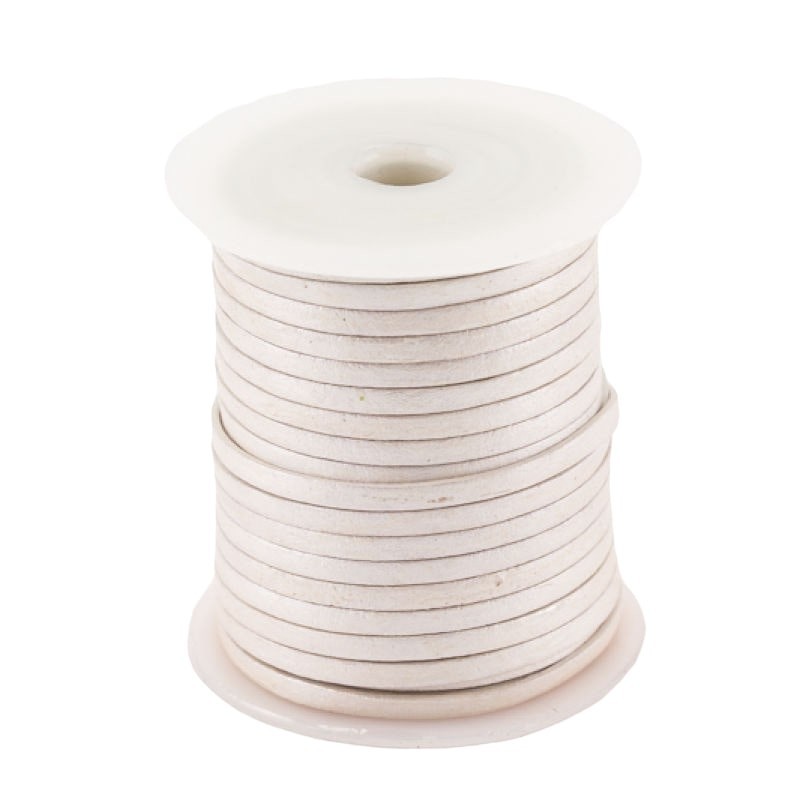 Bobine de lacet de cuir plat argent effet métallisé de 3mm de largeur, 1mm d'épaisseur et 25 mètres de longueur d'un seul tenant.