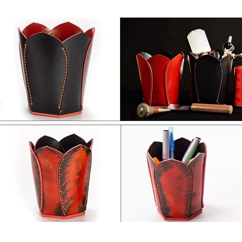 Patron en taille réelle, réutilisable en kraft, d'un pot à crayon en cuir. Dimensions : 8 x 11cm.